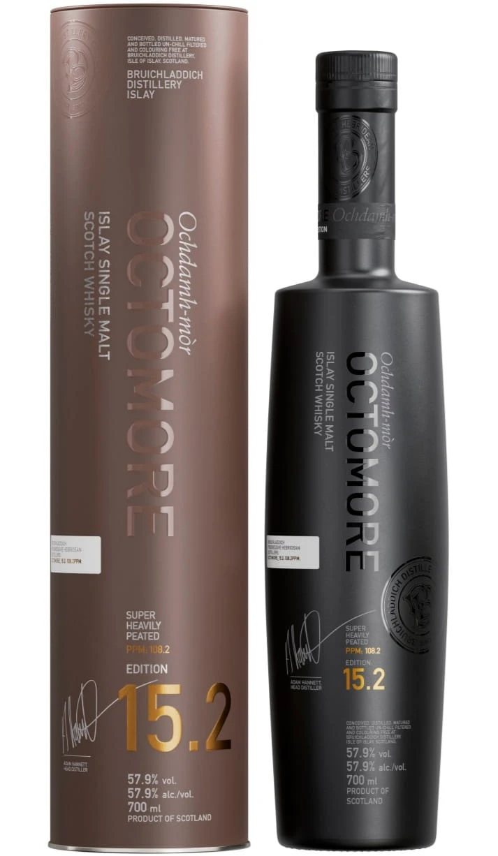 Octomore 15.2 to whisky, która mistrzowsko łączy rzemieślniczą tradycję z nowoczesnym podejściem do destylacji, oferując degustatorowi niezapomniane doznania. Choć sercem tego trunku jest potężny torfowy dym, co potwierdza poziom fenoli na poziomie 108,2 PPM, to jego prawdziwa siła tkwi w zaskakującej złożoności i harmonii. W kieliszku mieni się głęboką, złocisto-bursztynową barwą, a jej bukiet to intrygujące połączenie dymu, wanilii, nut drzewnych, karmelu oraz owocowych akcentów. Na podniebieniu dymna intensywność idealnie równoważy się z gładką, niemal kremową teksturą, prowadząc do długiego finiszu z wyraźnym posmakiem torfu i wytrawnych przypraw. To trunek, który w pełni odkrywa swój charakter podczas degustacji solo, ale jego wszechstronność pozwala również na tworzenie wyjątkowych połączeń kulinarnych z grillowanym mięsem, wędzonymi serami czy deserową ciemną czekoladą.